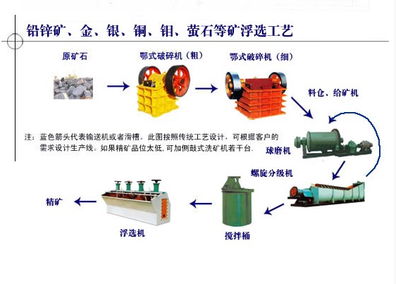 開(kāi)采的礦石先由顎式破碎機(jī)進(jìn)行初步破碎,在破碎至合理細(xì)度后經(jīng)由提升機(jī)、給礦機(jī)均勻送入球磨機(jī),由球磨機(jī)對(duì)礦石進(jìn)行粉碎、研磨。經(jīng)過(guò)球磨機(jī)研磨的礦石細(xì)料進(jìn)入下一道工序:分級(jí)。螺旋分級(jí)機(jī)借助固體顆粒的比重不同而在液體中沉淀的速度不同的原理,對(duì)礦石混合物進(jìn)行洗凈和分級(jí)。經(jīng)過(guò)洗凈和分級(jí)的礦物混合料在經(jīng)過(guò)磁選機(jī)時(shí),由于各種礦物的比磁化系數(shù)不同,經(jīng)由磁力和機(jī)械力將混合料中的磁性物質(zhì)分離開(kāi)來(lái)。 經(jīng)過(guò)磁選機(jī)初步分離后的礦物顆粒在被送入浮選機(jī),根據(jù)不同的礦物特性加入不同的藥物,使得 所要的礦物質(zhì)與其他物質(zhì)分離開(kāi)。在所要的礦物質(zhì)被分離出來(lái)后,因其含有大量水分,須經(jīng)濃縮機(jī)的初步濃縮,再經(jīng)烘干機(jī)烘干,即可得到干燥的礦物.