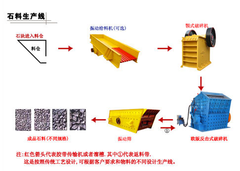 大塊石料經(jīng)料倉由振動給料機(jī)均勻地送進(jìn)鄂式破碎機(jī)進(jìn)行粗碎,粗碎后的石料由膠帶輸送機(jī)送到反擊式破碎機(jī)進(jìn)行進(jìn)一步破碎;細(xì)碎后的石料由膠帶輸送機(jī)送進(jìn)振動篩進(jìn)行篩分,篩分出幾種不同規(guī)格的石子,滿足粒度要求的石子由成品膠帶輸送機(jī)送往成品料堆;不滿足粒度要求的石子由膠帶輸送機(jī)返料送到反擊式破碎機(jī)進(jìn)行再次破碎,形成閉路多次循環(huán)。成品粒度可按照用戶的需求進(jìn)行組合和分級,為保護(hù)環(huán)境,可配備輔助的除塵設(shè)備。