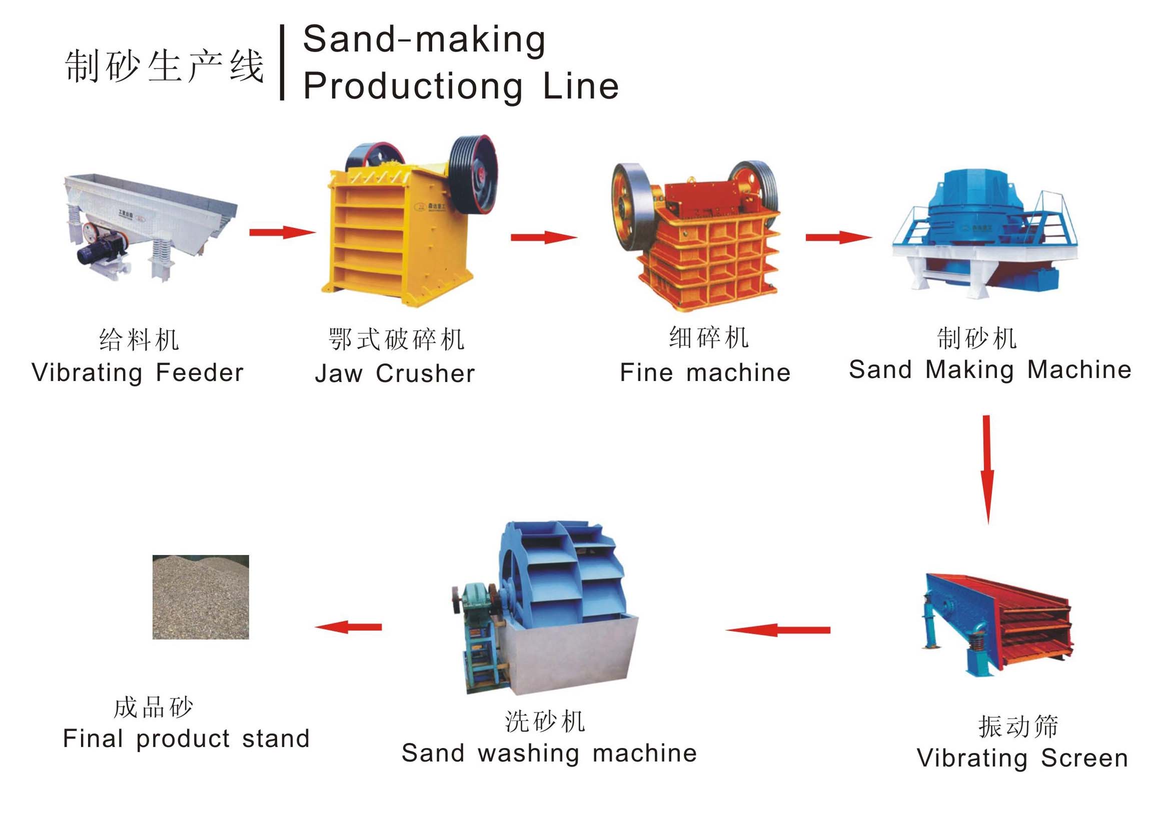 進(jìn)制砂機(jī)的石子一部分制成砂,經(jīng)洗砂機(jī)(可選)清洗后制成成品砂,另一部分進(jìn)制砂機(jī)再次破碎。